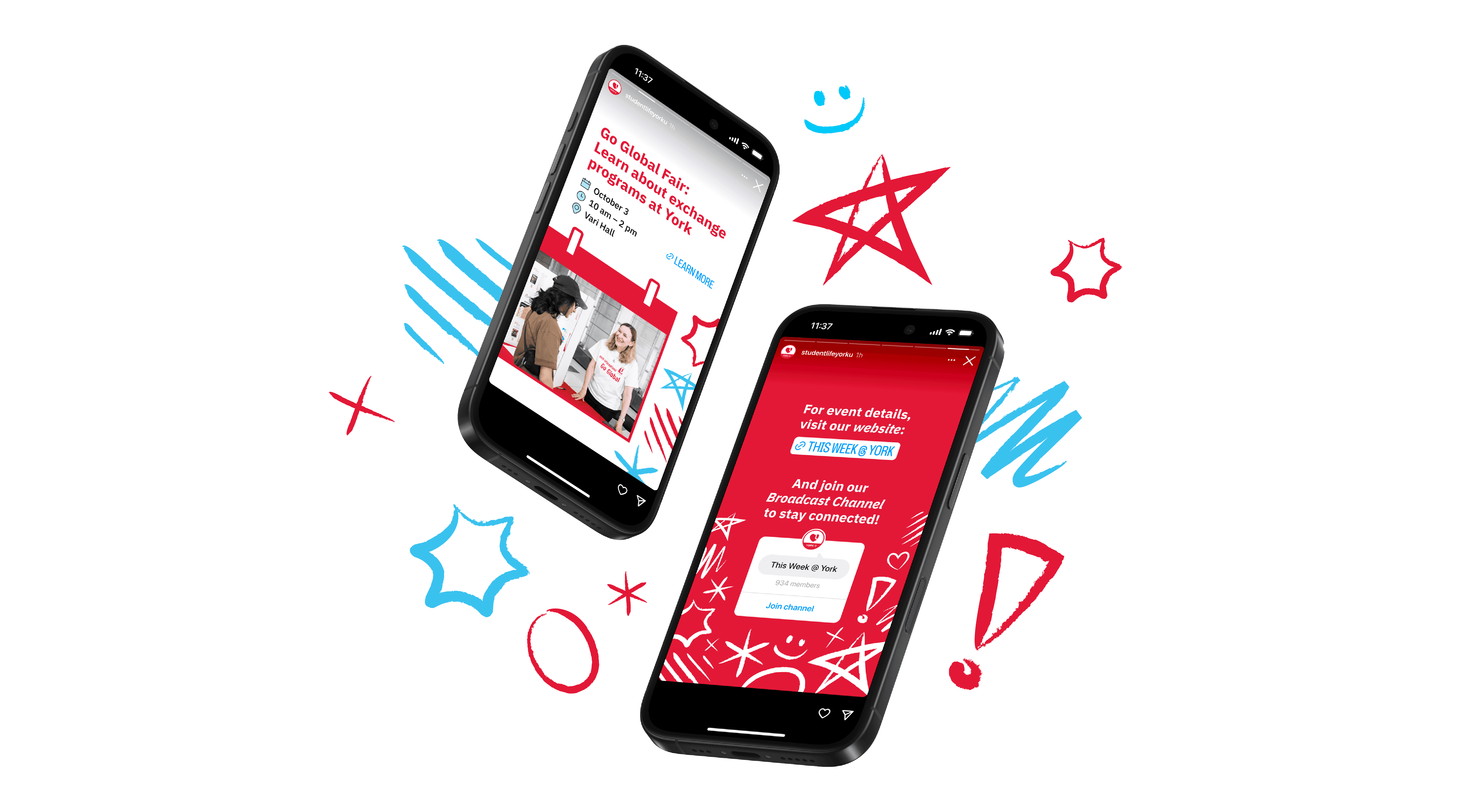 Originally, TW@Y was only shared with students via email and posted on its website. However, a panel discussion with students revealed that engagement would likely soar if it expanded to social media as well. Therefore, faced with the need for expanded reach, I was tasked to design a new, student-relevant visual identity for TW@Y within the York brand so that its materials may be recognized across platforms.